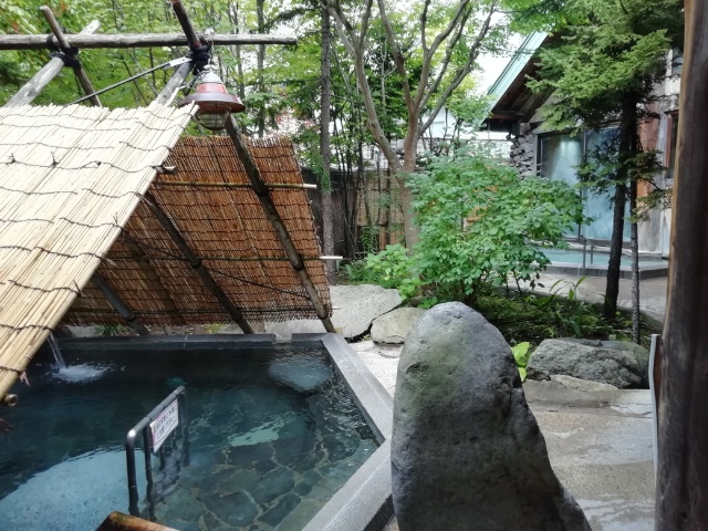 完全に掛け流しオンリーなので上だけ激熱。かき混ぜ棒おいてある。熱い方は48℃くらい、ぬるい方には、洗い場の石鹸の泡が飛んで入っている。んー。
