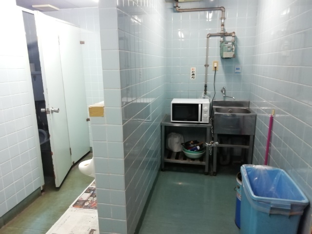 (トイレ横に電子レンジと今時トイレに灰皿。俺は気にせん)